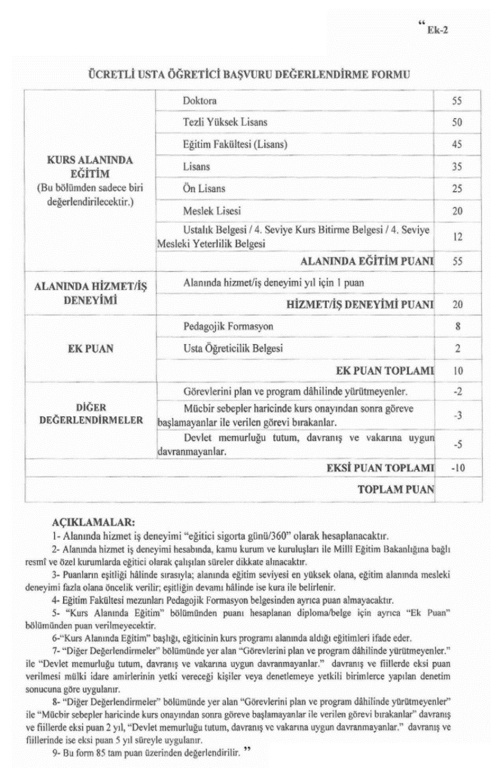 ÜCRETLİ USTA ÖĞRETİCİ BAŞVURU DEĞERLENDİRME FORMU